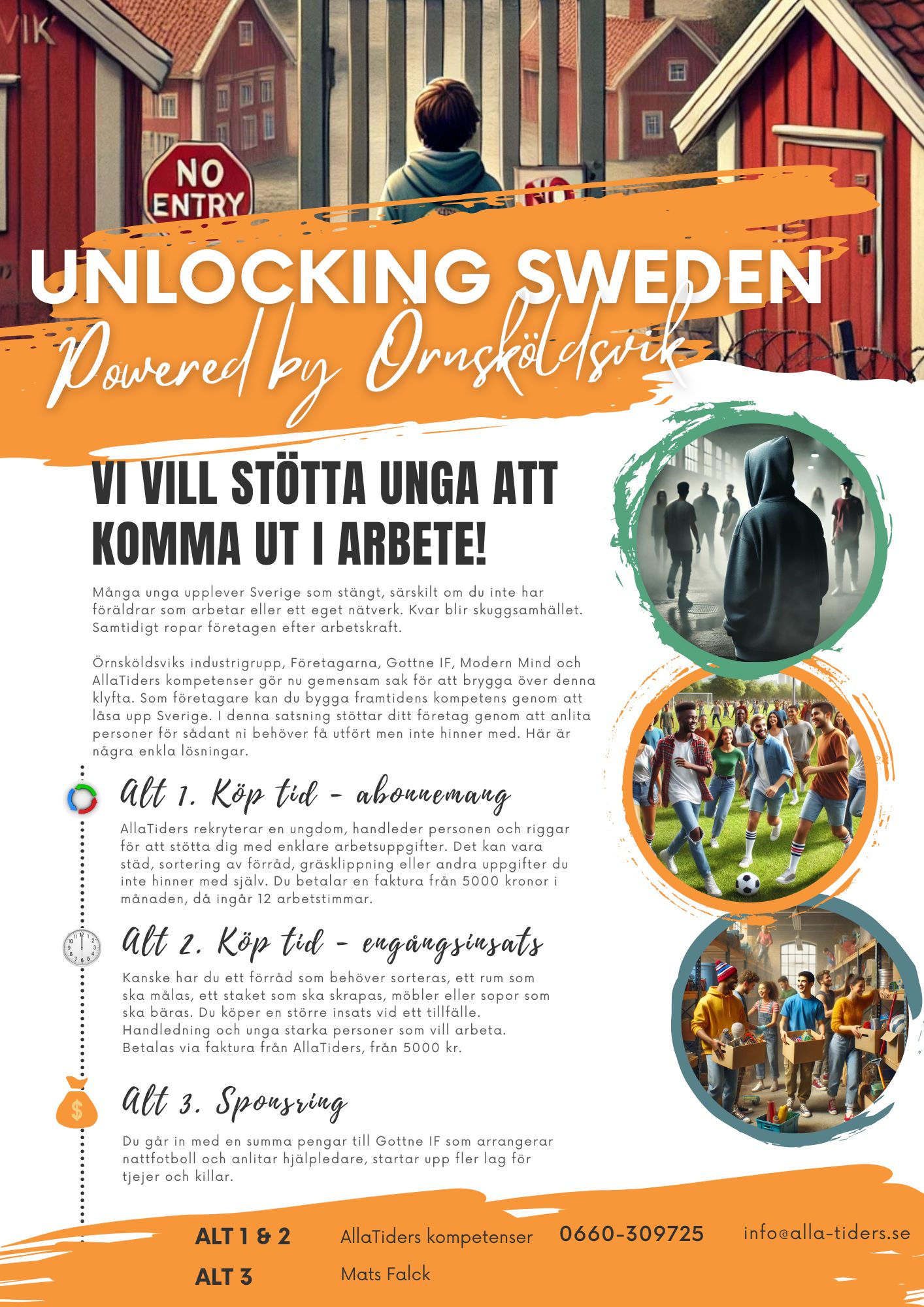 Vi driver projekt som, i samarbete med våra kunder, öppnar upp Sverige för fler. Just nu söker vi företag som vill vara med och skapa jobb under konceptet Unlocking Sweden – powered by Örnsköldsvik, med särskilt fokus på brottsförebyggande insatser.